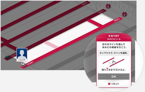 参加ユーザーの数だけあみだくじの縦線が増え、さらに横線は自由に追加することができる、あみだくじサイトです。