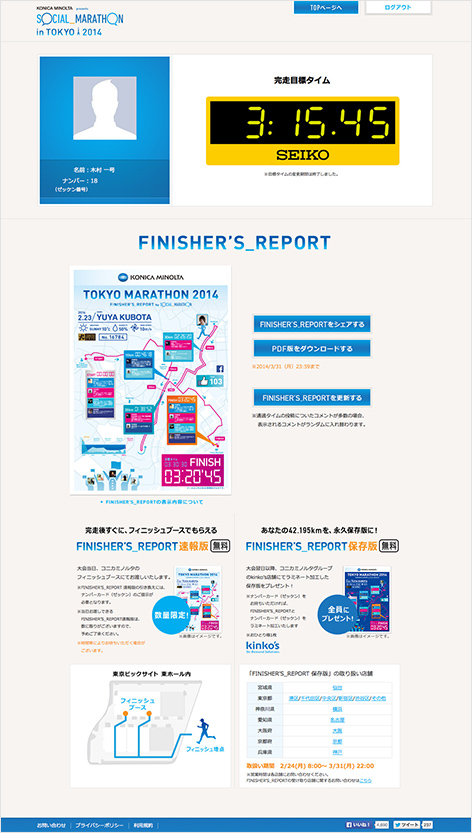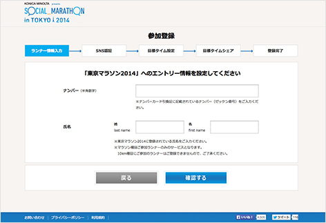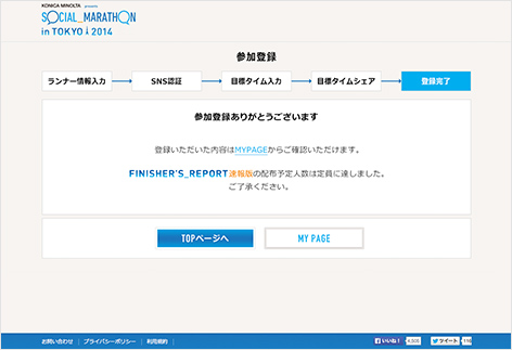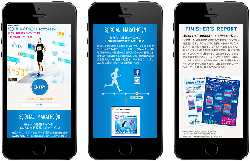 東京マラソン2014の通過タイムをFacebookまたはTwitterに自動投稿できるサービス「SOCIAL_MARATHON in TOKYO 2014」のWebサイトです。