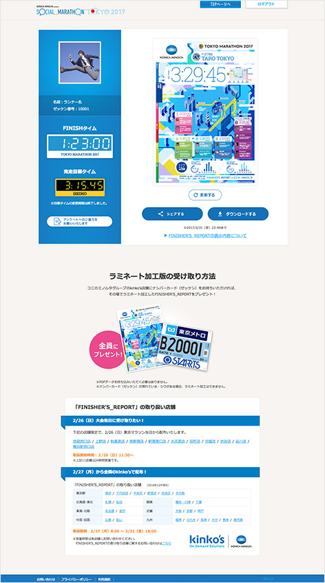 東京マラソンの大会中、コース通過タイムをFacebookまたはTwitterへ自動投稿するWebサービス「SOCIAL_MARATHON TOKYO」。