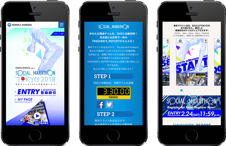 東京マラソンの大会中、コース通過タイムをFacebookまたはTwitterへ自動投稿するWebサービス「SOCIAL_MARATHON TOKYO」。