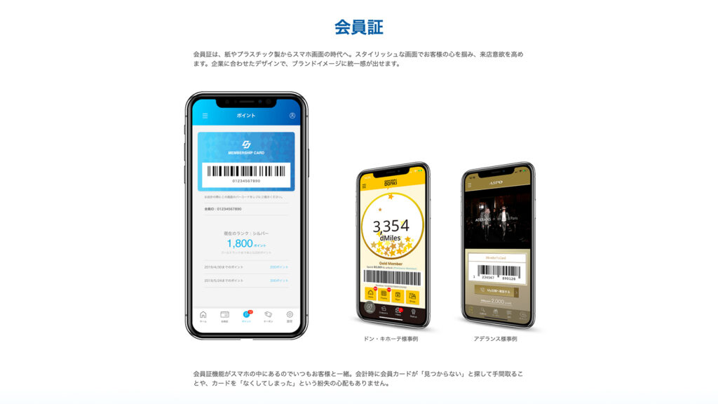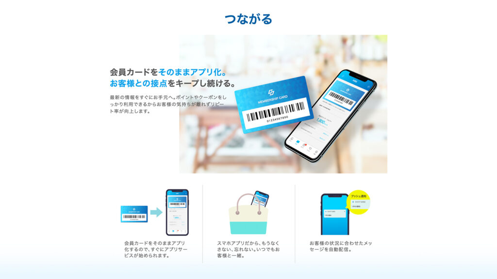ネットドリーマーズ社が提供する会員証アプリ「SMART会員証」のUIデザインとサービスサイトをリニューアルいたしました。 ロイヤルカスタマーの醸成、囲い込みを実現するSMART会員証。サイトでは「つながる」「深まる」「広がる」というキーワードを軸に、利用者の生活の中にアプリが自然と溶け込んでいる様子を表現しました。また、アプリUIデザインではヒューリスティック調査を実施し、利用者もサービス提供者も直感的に操作できるストレスのないUIデザインを目指しました。ブルーを基調とした柔らかなグラデーションで、様々な画像が入ってもスッキリと見えるような包括的なデザインとしています。