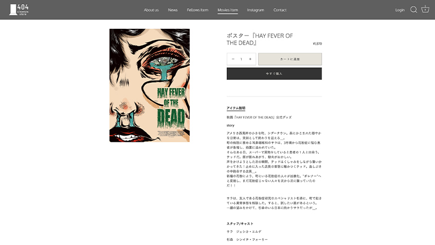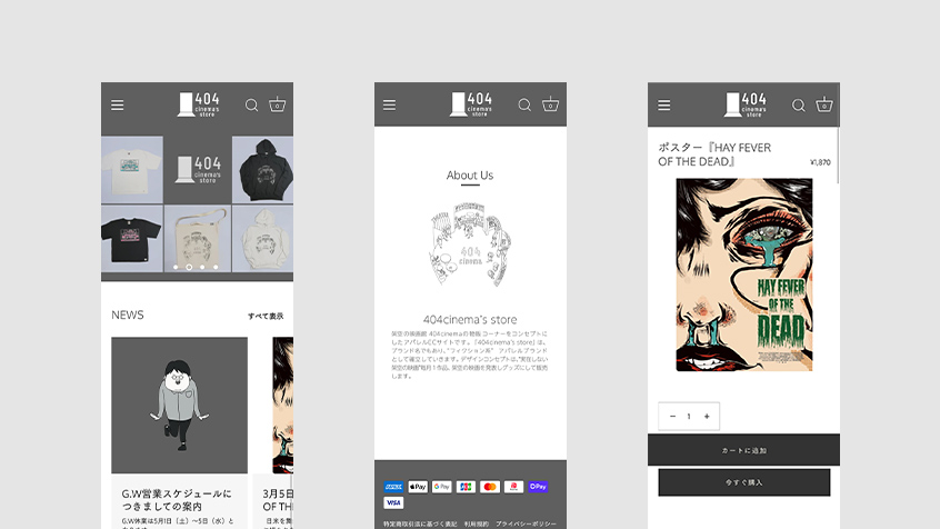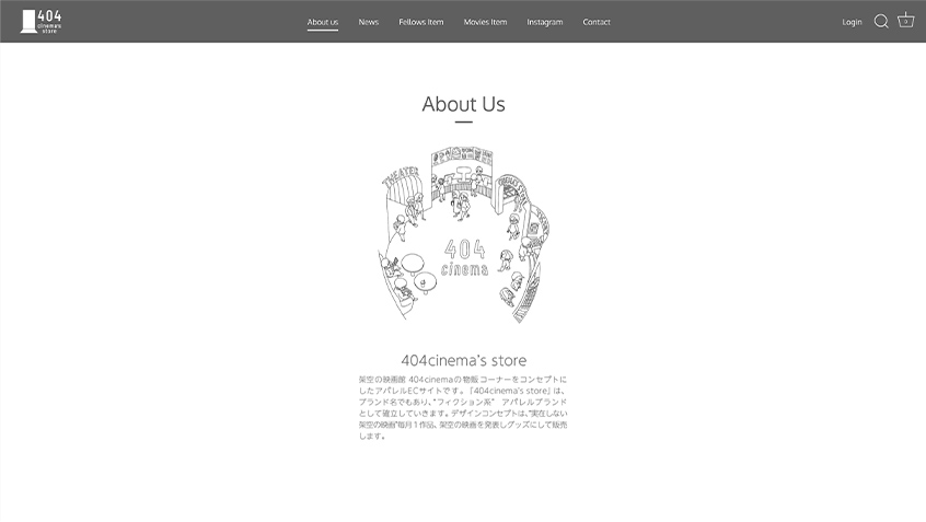 架空の映画館404cinemaの物販コーナーをコンセプトにしたアパレルECサイトです。スモールスタートで始めやすいECプラットフォームの1つ「Shopify」を利用して構築いたしました。
