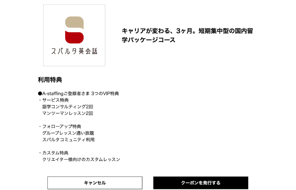 ②「利用特典」をご確認いただき、右下のボタンでクーポンを発行してください。