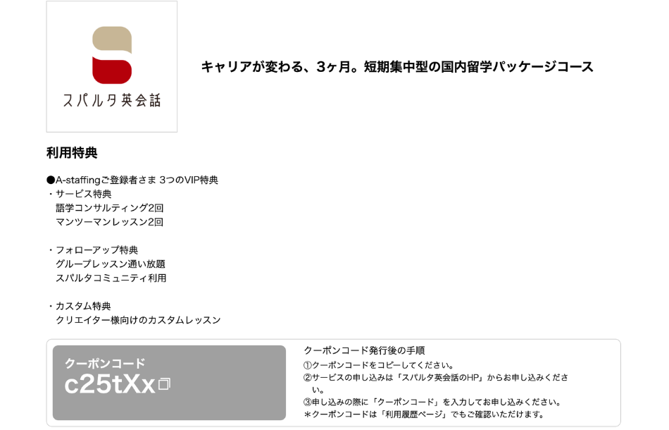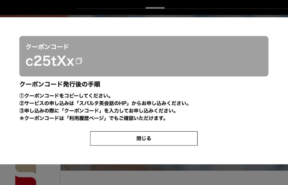 ④「マイページ」にクーポンコードが残ります。 コピーしていただき「スパルタ英会話のHP」に直接お問い合わせをしてご利用ください。