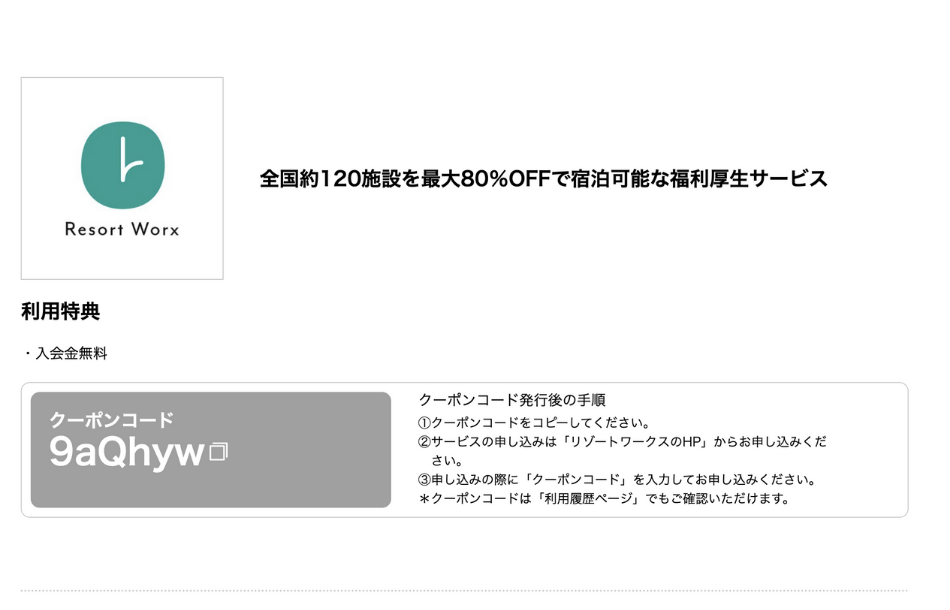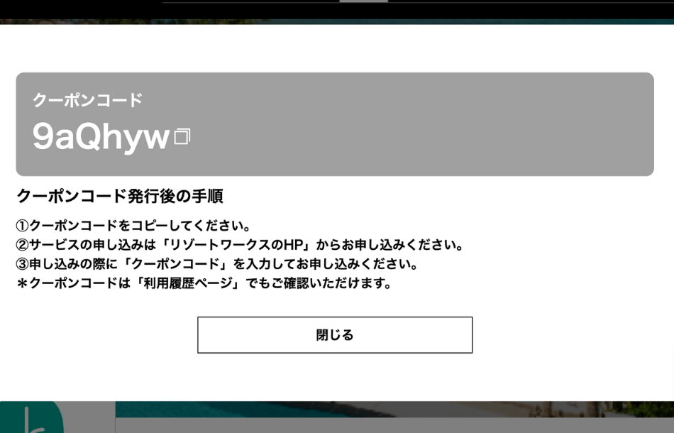 ④「マイページ」にクーポンコードが残ります。 コピーしていただき「リゾートワークスのHP」に直接お問い合わせをしてご利用ください。